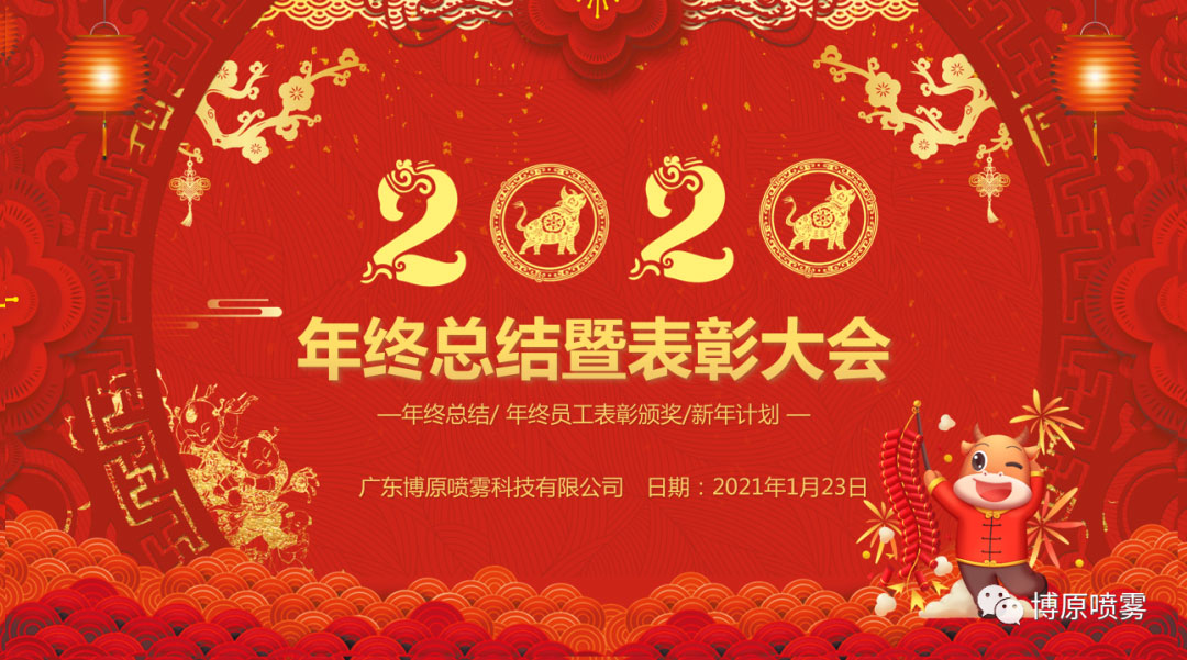 2021年1月23日,廣東博原噴霧科技有限公司召開《2020年終總結暨表彰大會》,為響應國家政府號召,疫情期間,此次大會在工廠內部舉行。