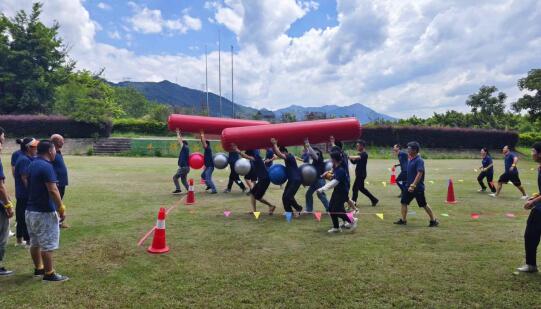 生活需要儀式感,工作需要?dú)w屬感,在教練的組織安排下,分別組成6支隊(duì)伍,分別完成昂首挺胸、協(xié)力競(jìng)走、開(kāi)心麻花、十拿九穩(wěn)、移花接木、打地鼠等一系列活動(dòng)。