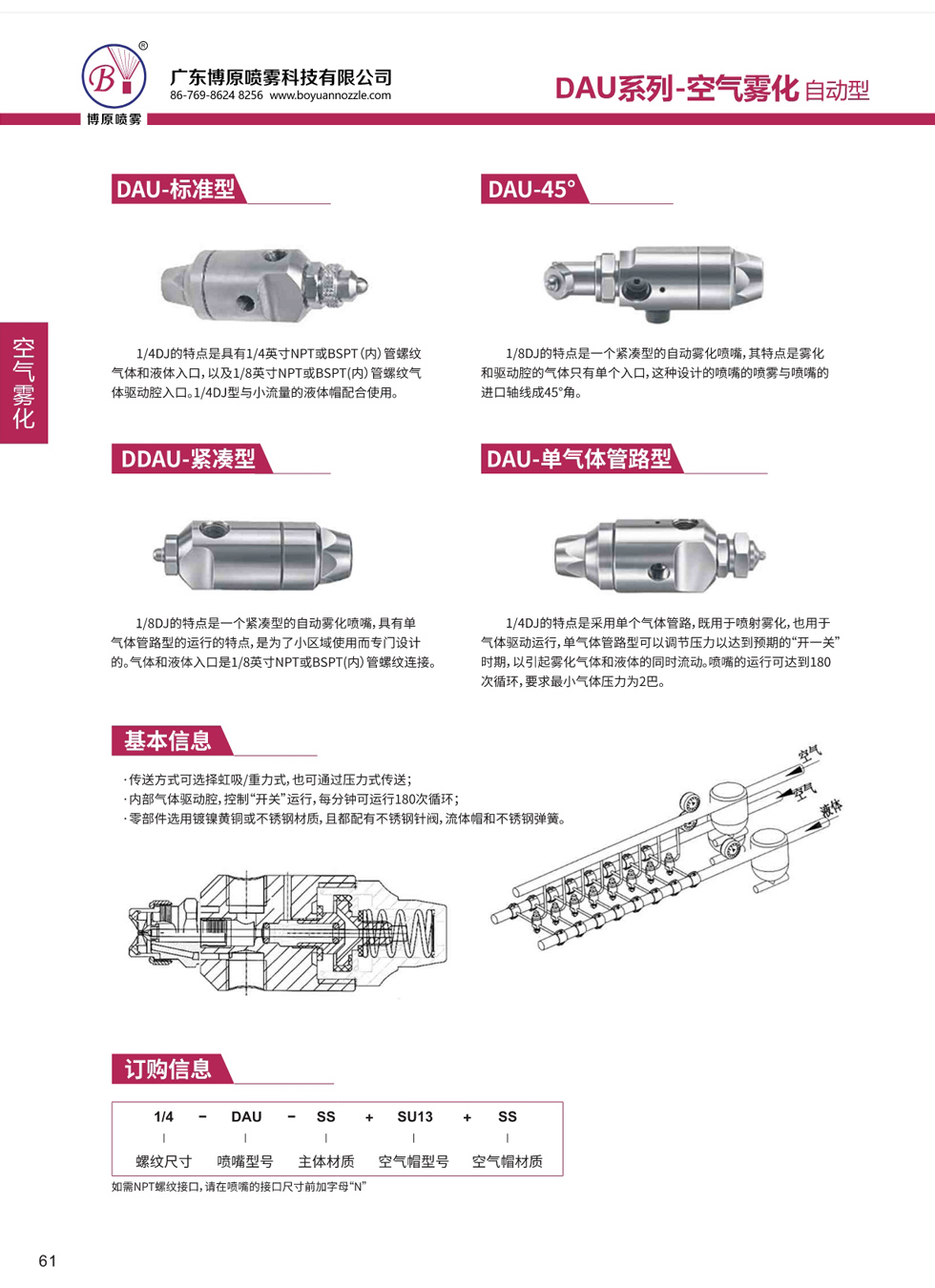 DAU自動(dòng)空氣霧化噴嘴,有一個(gè)內(nèi)部氣體驅(qū)動(dòng)腔用以控制開關(guān)運(yùn)行。噴嘴的液體流可采用虹吸式、重力式或者壓力式傳送。所有噴嘴組件可采用鍍鎳黃銅或者不銹鋼制造。所有的噴嘴內(nèi)部都有一個(gè)硬拉不銹鋼針閥,不銹鋼流體帽和不銹鋼回位彈簧。