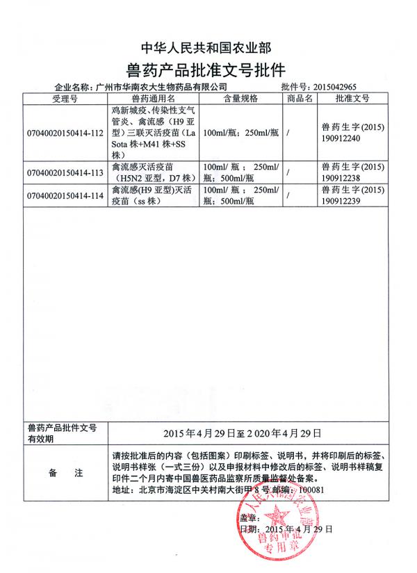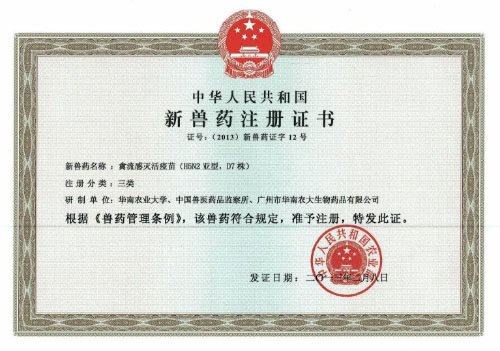 目前已獲得國家農業部新獸藥證書及產品批準文號。