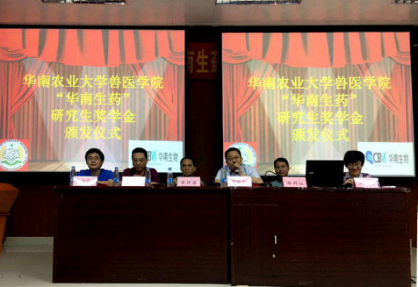 2017年5月24日上午,廣州市華南農(nóng)大生物藥品有限公司(下稱“華南生物”)在廣州華南農(nóng)業(yè)大學(xué)獸醫(yī)學(xué)院開(kāi)展了2017年“華南生藥”研究生獎(jiǎng)學(xué)金頒獎(jiǎng)典禮,同時(shí)進(jìn)行了“創(chuàng)新中的華南生物及就業(yè)指導(dǎo)”課程分享。