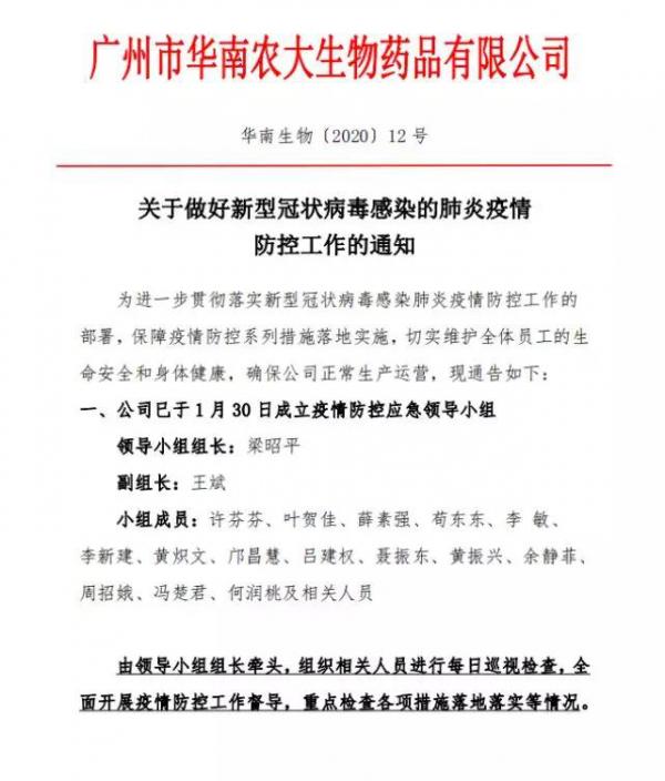 2020年2月12日,增城區(qū)委副書記、增城區(qū)區(qū)長(zhǎng)趙國(guó)生帶領(lǐng)增城區(qū)科工商信局一行5人,蒞臨廣州市華南農(nóng)大生物藥品有限公司(以下簡(jiǎn)稱:華南生物)開(kāi)展企業(yè)復(fù)工復(fù)產(chǎn)工作調(diào)研。