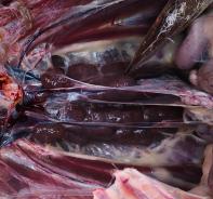 現(xiàn)場剖檢4只鵝,4/4只鵝出現(xiàn)腸粘膜脫漏、腸道充滿血樣液體、空腸回腸出現(xiàn)蠟樣栓塞;4/4只鵝出現(xiàn)胰腺有壞死點;4/4只鵝腎腫脹;呼吸道癥狀不明顯,如下圖: