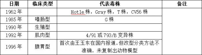 雞傳染性支氣管炎是一種廣泛存在的對家禽業(yè)造成巨大經(jīng)濟影響的家禽疾病。不斷出現(xiàn)的新的IBV基因型及不同基因型之間缺少交叉保護已經(jīng)成為防控IBV的重要挑戰(zhàn)。IBV致病型(臨床型)與IBV毒株血清型/基因型之間并無必然的聯(lián)系,不同血清型或基因型毒株可能屬于相同致病型。同時,屬于同一血清型或基因型的IBV毒株可能屬于不同致病型。現(xiàn)就雞傳染性支氣管炎病毒臨床分型和代表毒株說明如下: