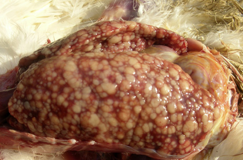 6、雞馬立克氏病:內臟型馬立克肝臟比正常大 3-5 倍,表面和切面可見灰白色斑駁狀腫瘤病灶。