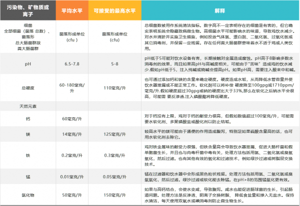 雞對水源中的礦物質有較強的耐受力。但要注意微生物的生長,因為許多礦物質也是微生物的營養物。最好通過軟化的手段控制錳、硫磺、鈉、鎂離子的含量,也間接地防止水垢生成。