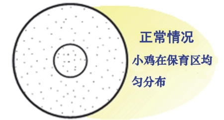 (3)雞舍內(nèi)的溫度要保持均衡和穩(wěn)定,避免溫度忽高忽低和雞舍兩端溫差過(guò)大,檢查溫度是否合適的最佳方法,是觀察雞苗的分布狀態(tài)及活動(dòng)表現(xiàn)(如下圖,中間小圓圈為加熱器)。